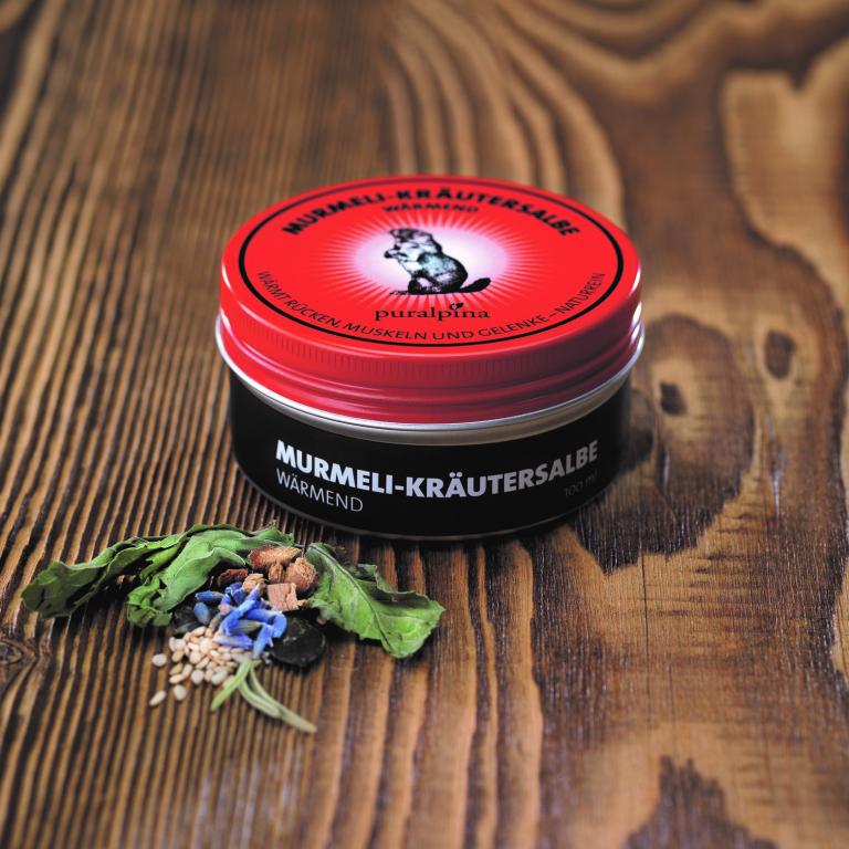 Naturreine Salbe, mit Murmeltieröl, Gemsfett, Hanf, Olivenöl, Johanniskraut, Wallwurz, Weizenkeim, Leinsamen, Dachsfett, Lavendel, Minze, Rosmarin, Farnkraut, Kürbiskern, Propolis, Sesam, Eichenrinde